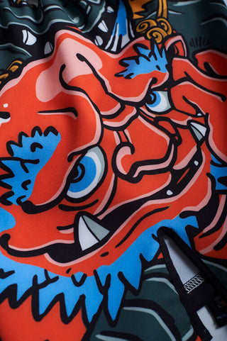 The MMA shorts Manto Yauhen Abu ONI are MMA, grappling, and fitness training shorts, made of stretch and durable fabric. These versatile and practical shorts, light and flexible allow you to move freely during your most intense workouts. The elastic waistband with drawstring features anti-slip details to ensure a firm and stable fit. The graphics created in collaboration with tattoo artist Yauhen Abu are themed around a demon Oni: this mythological creature from Japanese folklore represents ferocity and determination, courage, strength, and protection.